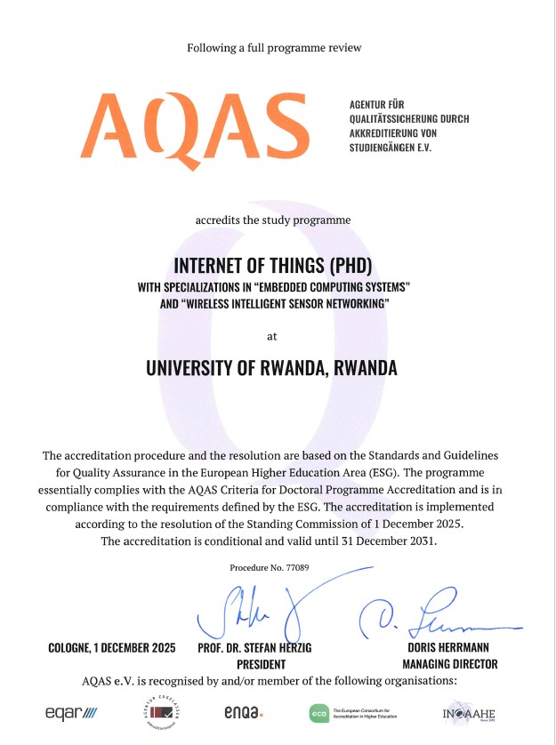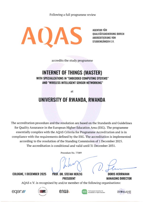 In a remarkable milestone for African innovation and higher education, UR’s African Centre of Excellence in Internet of Things (ACE-IoT) has been awarded international accreditation by Agency for Quality Assurance through Accreditation of Study Programs (AQAS), one of Europe’s most respected quality assurance and accreditation agencies based in Germany.